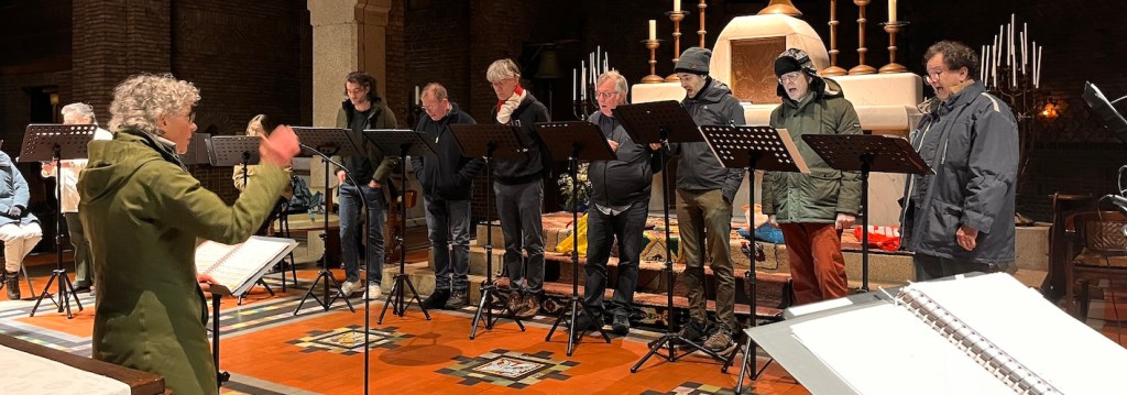 The show must go on! Het zijn arctische temperaturen in de Vredeskerk waar we repeteren maar met dikke jas aan en (sommigen) een muts op is het prima te doen. Over twee weken zingen we, aansluitend op de mis in de Vredeskerk, om 13:00 uur een repertoire van Christmas Carols in de Sociëteit van het Amstelhuis.