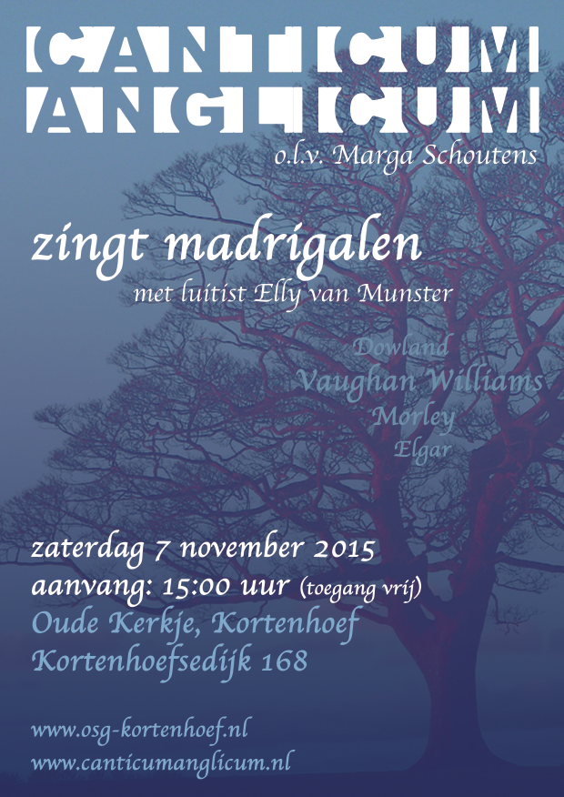 Canticum Anglicum repeteert het prachtige repertoire van oud-Engelse madrigalen van Ralph Vaughan-Williams, Thomas Morley, John Dowland en Edward Elgar voor het concert op zaterdagmiddag 7 november in het Oude Kerkje aan de Kortenhoefsedijk 168 te Kortenhoef (15:00 uur aanvang, toegang gratis). Het repertoire is doortrokken van referenties aan bomen. Van de ‘sycamore tree’ waaronder men zit te zuchten, de wilgen die zingen tot de treurende cypressen.