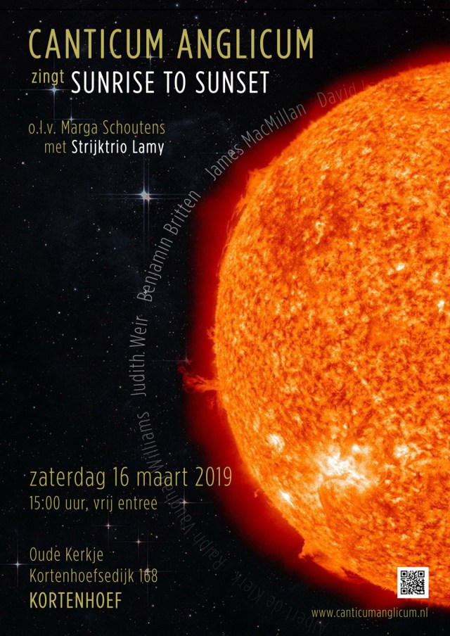 Op zaterdag 16 maart zong Canticum Anglicum onder leiding van onze vaste dirigent Marga Schoutens in het Oude Kerkje in Kortenhoef een programma met voornamelijk werken uit de 20ste en 21ste eeuw met het thema ‘Sunrise to Sunset’. Gezongen werd onder andere My Guardian Angel van Judith Weir en Again van David Lang.