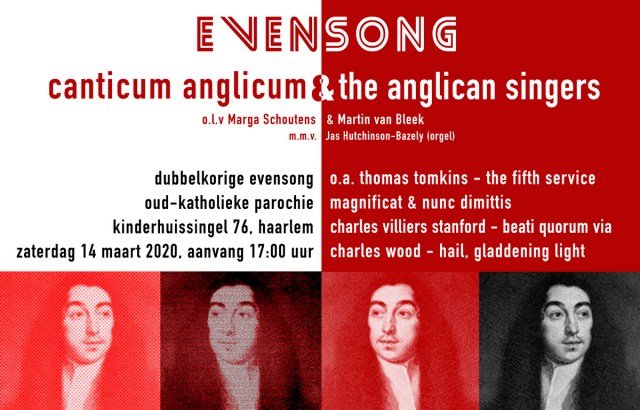 Op zaterdag 14 maart zingt Canticum Anglicum in samenwerking met The Anglican Singers te Haarlem een dubbelkorig Evensong, een Anglicaanse kerkdienst die bijna in zijn geheel wordt gezongen.